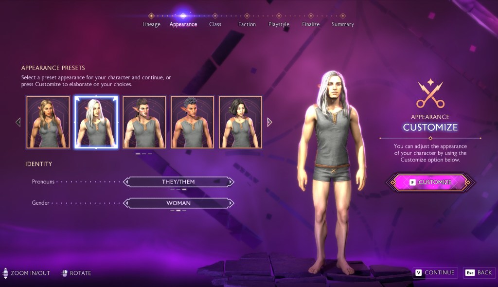So, here’s my quick take: They don’t affect me, but I’m glad they’re there. I think the conversation around them being forced on people or shoved down people’s throats is disengenous. It’s hard for me to say these new menu options force a viewpoint or an agenda on someone when the implementation is so small. It is usually one box, asking someone their character’s preferred pronouns, maybe body type, and maybe there’s more options when picking your voice line. The only time I’ve had a criticism around these options is one time I felt the option for pronouns was shown a bit late in the process for someone who would use it.