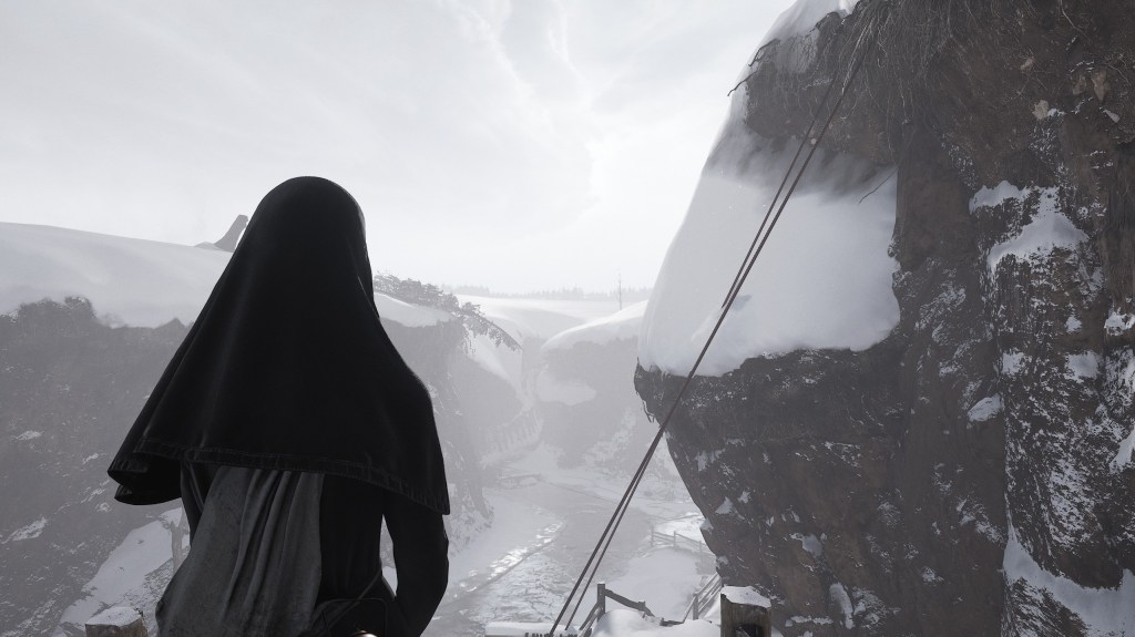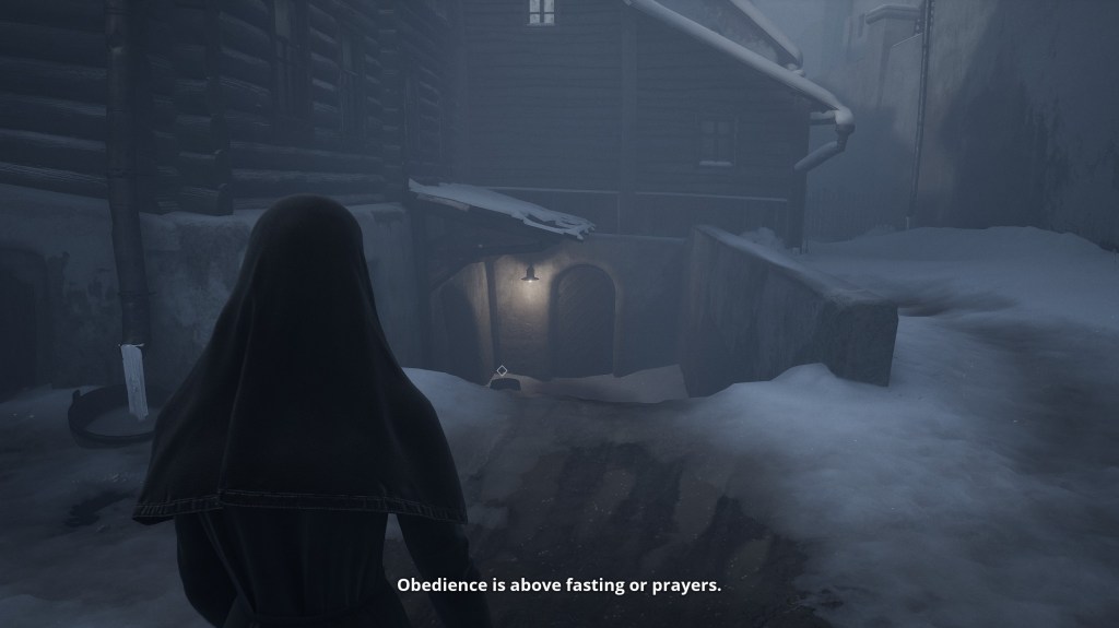 As we start to spend time with Indika we realize definitely does not fit into this cloister, she has a voice in her head feeding her constant doubts and hallucinations, causing issues for her fellow nuns. Eventually she’s sent on a task that sets her onto the story that makes her feel salvation is still possible for her. What I appreciated about the beginning is that Indika isn’t defiant about being a nun, she isn’t flippant about her role. She’s trying her best, but the structure of the cloister isn’t built to support her. None of the other nuns seem to care about her, a part right at the start of the game drove this home where you’re filling a barrel with water from a well. You’ve been tasked to do this, it takes forever, the gameplay loop is mundane and when you finally fill it up, your fellow nun dumps all the water into the freezing snow.