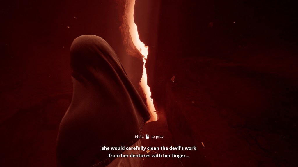 Here is where the game dissects its views on religion and I think it’s done in a way that I preferred. Religion is such a hard topic to get right, because it has a ton of built in bias. If you’re writing about religion, you’re either for or against it, you’re not spending time to write about it if you’re ambivalent. But what I think Indika does well is it questions it in a way that doesn’t shot it down, but more just nudges against it. The core conversation around religion in this game is what is the point of choice if I’m supposed to chose the morally good option every time? Why was I brought to this earth to make a choice if the explained alternative is pain and suffering? Doesn’t that make the choice meaningless at that point? If there is a God that says choose this path and you get to be with me and if you don’t well…you have to go somewhere that is just horrible, but I can’t help you if you go there, that is a hard pill to swallow. Which, I’m sure those that do believe have explanations around divine plans or how it’s meaningful to make those decisions or a dozen other different interpretations. What Indika does well is that it offers it purely as Indika’s view, sure that’s probably the developer’s view because they made the game and the game definitely skews towards that narrative, but I don’t think it’s trying to change anyone’s mind. It wants to say its piece and leave it there.